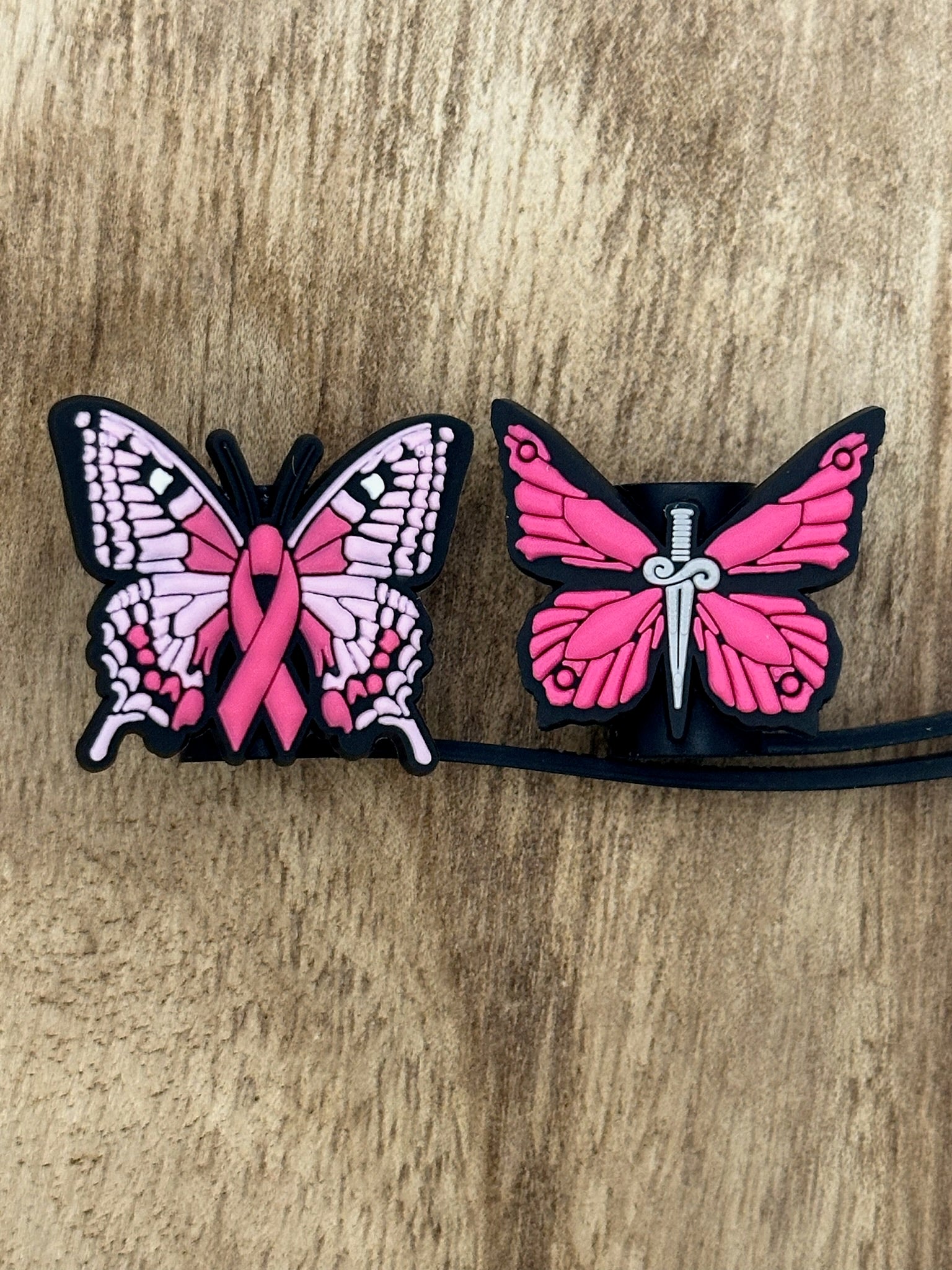 Sip in solidarity and style with our Breast Cancer Butterfly Straw Topper Set. This set includes two intricately crafted butterfly-shaped toppers, each bearing a unique symbol of support for those affected by breast cancer. One topper features a delicate pink breast cancer ribbon, symbolizing hope and solidarity in the fight against breast cancer. The other topper showcases a bold dagger design, representing strength and resilience in the face of adversity. With each sip, you'll not only enjoy your favorite beverages but also show your unwavering support for an important cause. Elevate your drinkware and spread awareness with our Breast Cancer Butterfly Straw Topper Set.