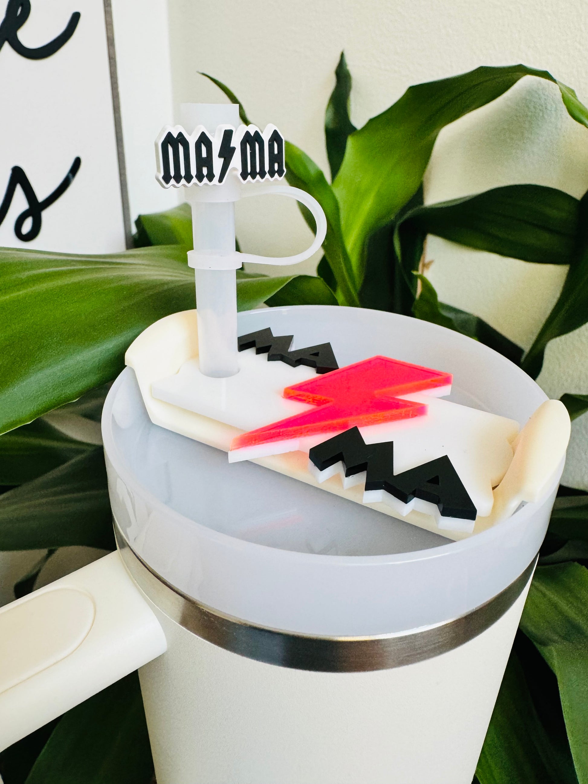 The Tumbler Topper, showcasing the bold "Mama" in the distinctive AC/DC style text, is perfect for those who want to bring rock 'n' roll attitude to their drinks. On the other hand, the Straw Topper adds a touch of rebellious flair to your sips, providing a unique and stylish way to enjoy your favorite beverages.